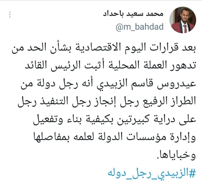 واعتبر في تغريدة على حسابه بموقع التدوين المصغر تويتر اليوم: "بعد قرارات اليوم الاقتصادية بشأن الحد من تدهور العملة المحلية أثبت الرئيس القائد عيدروس قاسم الزُبيدي أنه رجل دولة من الطراز الرفيع".