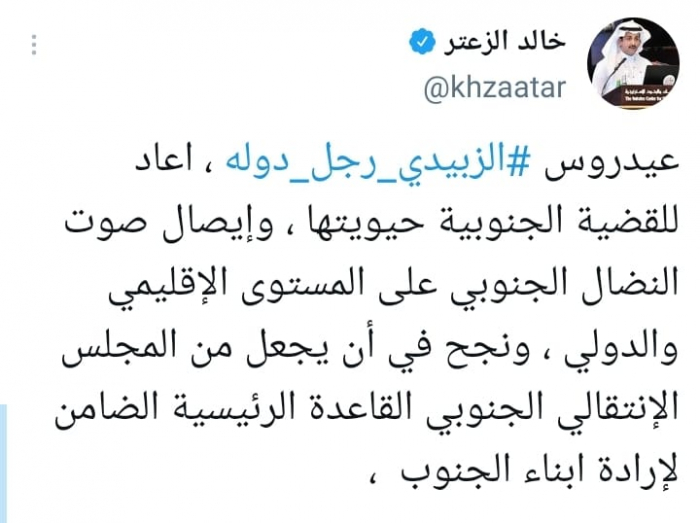 وأكد في تغريدة على حسابه بموقع التدوين المصغر تويتر اليوم أن: "عيدروس الزُبيدي رجل دولة، أعاد للقضية الجنوبية حيويتها".