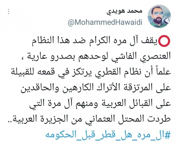 وأضاف: "علماً أن نظام القطري يرتكز في قمعه للقبيلة على المرتزقة الأتراك الكارهين والحاقدين على القبائل العربية ومنهم آل مرة التي طردت المحتل العثماني من الجزيرة العربية"، مختتما بهاشتاج: "آل مره هل قطر قبل الحكومة".