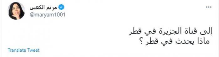 وقالت في تغريدة عبر "تويتر" رصدها "المشهد العربي": "إلى قناة الجزيرة في قطر ماذا يحدث في قطر؟".