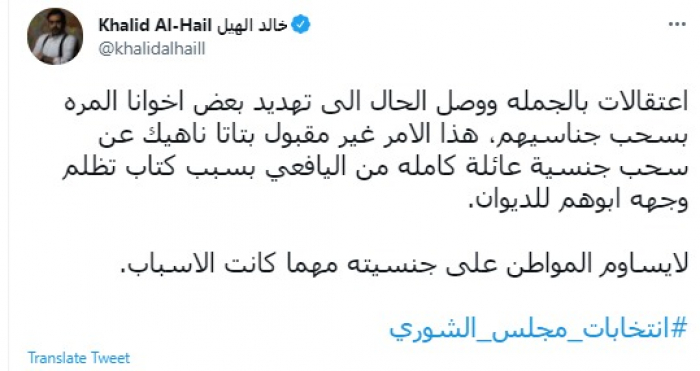 وقال في تغريدة عبر "تويتر" رصدها "المشهد العربي": "اعتقالات بالجملة ووصل الحال الى تهديد بعض إخوانا المرة بسحب جناسيهم، هذا الأمر غير مقبول بتاتا ناهيك عن سحب جنسية عائلة كاملة من اليافعي بسبب كتاب تظلم وجهه ابوهم للديوان".