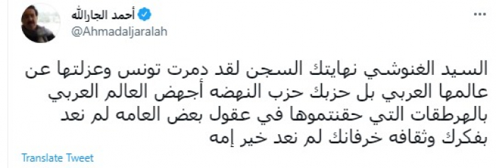 وقال في تغريدة عبر "تويتر" رصدها "المشهد العربي": "السيد الغنوشي نهايتك السجن لقد دمرت تونس وعزلتها عن عالمها العربي بل حزبك حزب النهضة أجهض العالم العربي بالهرطقات التي حقنتموها في عقول بعض العامة لم نعد بفكرك وثقافه خرفانك لم نعد خير أمة".