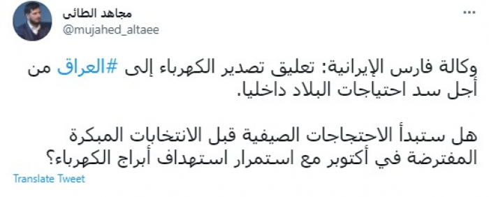 وقال في تغريدة عبر "تويتر" رصدها "المشهد العربي": "وكالة فارس الإيرانية: تعليق تصدير الكهرباء إلى العراق من أجل سد احتياجات البلاد داخليا.. هل ستبدأ الاحتجاجات الصيفية قبل الانتخابات المبكرة المفترضة في أكتوبر مع استمرار استهداف أبراج الكهرباء؟".