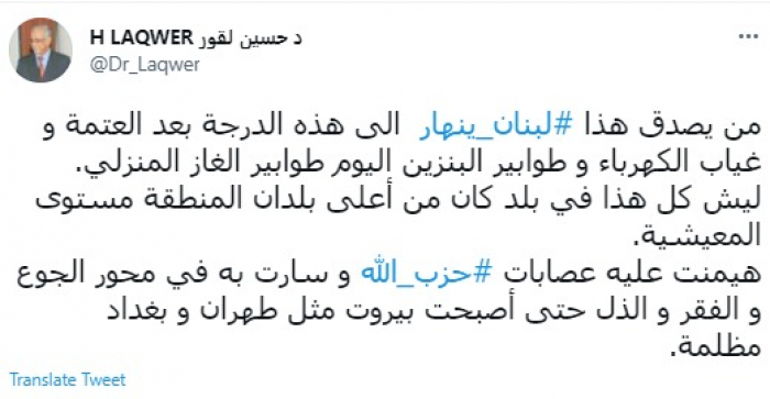 وأضاف: "ليش كل هذا في بلد كان من أعلى بلدان المنطقة مستوى المعيشية.. هيمنت عليه عصابات حزب الله وسارت به في محور الجوع والفقر والذل حتى أصبحت بيروت مثل طهران و بغداد مظلمة".