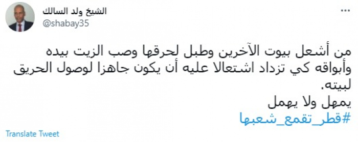 وقال في تغريدة عبر "تويتر" رصدها "المشهد العربي": "من أشعل بيوت الآخرين وطبل لحرقها وصب الزيت بيده وأبواقه كي تزداد اشتعالا عليه أن يكون جاهزا لوصول الحريق لبيته. يمهل ولا يهمل.. قطر تقمع شعبها".