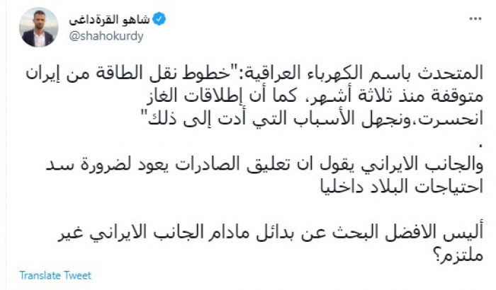 دعا الكاتب الصحفي العراقي شاهو القرةداغي، اليوم الثلاثاء، حكومة بلاده للبحث عن بدائل لأزمة وقف إيران لتصدير الكهرباء إلى العراق.