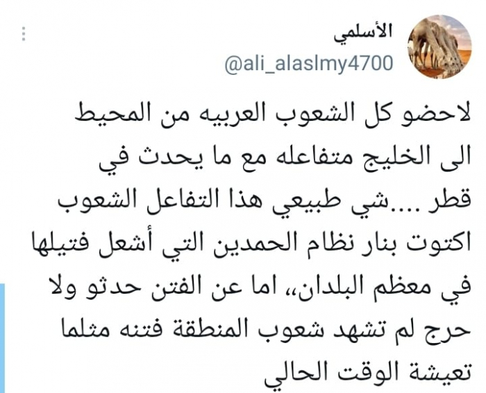 وأوضح أنه: "شيء طبيعي هذا التفاعل الشعوب اكتوت بنار نظام الحمدين التي أشعل فتيلها في معظم البلدان،، أما عن الفتن حدثوا ولا حرج لم تشهد شعوب المنطقة فتنة مثلما تعيشه الوقت الحالي".