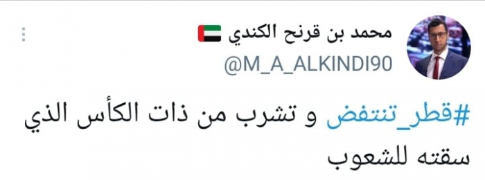 وأوضح في تغريدة على حسابه بموقع التدوين المصغر تويتر اليوم أن: "قطر تنتفض و تشرب من ذات الكأس الذي سقته للشعوب".