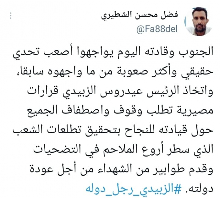وشدد على أن: "اتخاذ الرئيس عيدروس الزُبيدي قرارات مصيرية تطلب وقوف واصطفاف الجميع حول قيادته للنجاح بتحقيق تطلعات الشعب الذي سطر أروع الملاحم في التضحيات وقدم طوابير من الشهداء من أجل عودة دولته"، مختتما بهاشتاج: "الزبيدي رجل دولة".