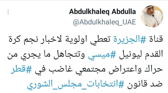 سخر الأكاديمي الإماراتي الدكتور عبدالخالق عبدالله، من تركيز قناة الجزيرة القطرية على أنباء انتقال اللاعب ليونيل ميسي إلى نادي فرنسي، وتجاهلها الحراك الشعبي في الدوحة ضد قانون الانتخابات.