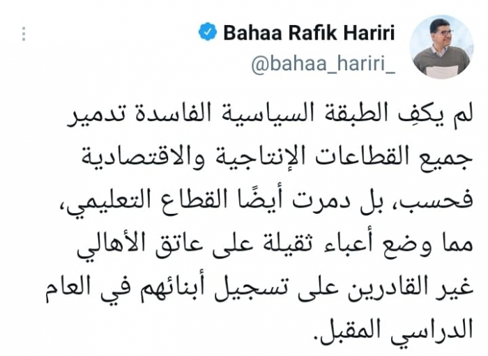استنكر رجل الأعمال اللبناني البارز بهاء الحريري، نجل رئيس وزراء لبنان الأسبق رفيق الحريري، تدمير الطبقة السياسية الفاسدة لقطاع التعليم.