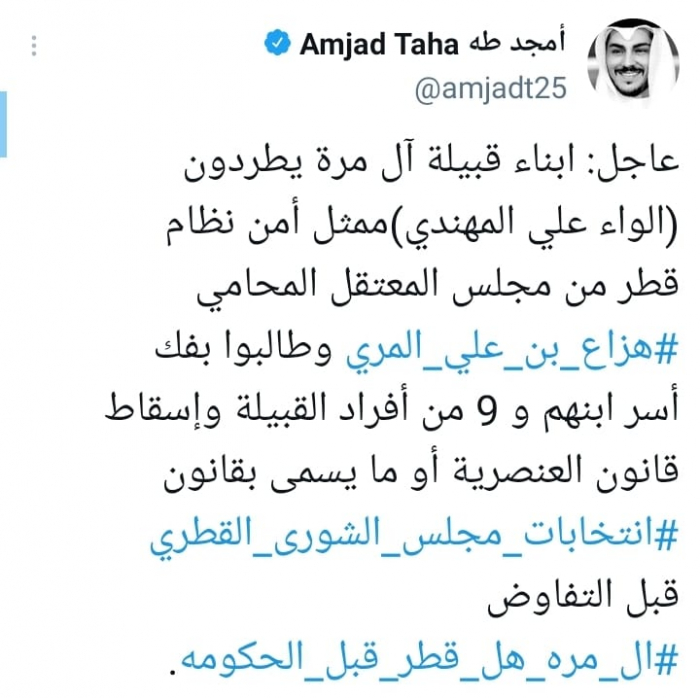 وأشار في تغريدة على حسابه بموقع التدوين المصغر تويتر اليوم إلى أن: "عاجل: أبناء قبيلة آل مرة يطردون (اللواء علي المهندي) ممثل أمن نظام قطر من مجلس المعتقل المحامي هزاع بن علي المري".