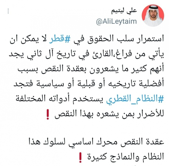 اعتبر الباحث السياسي علي ليتيم أن عقدة النقص تحكم سياسات النظام القطري تجاه مواطنيه والدول العربية، وتدفعه للإضرار بمنافسيه.