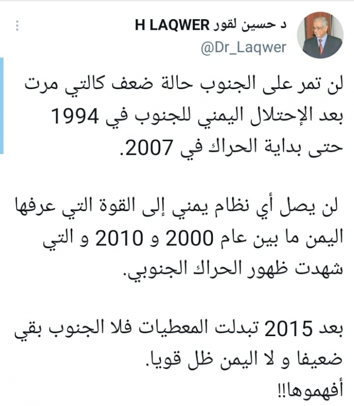 وأكد في تغريدة على حسابه بموقع التدوين المصغر تويتر، اليوم أنه: "لن تمر على الجنوب حالة ضعف كالتي مرت بعد الإحتلال اليمني للجنوب في 1994 حتى بداية الحراك في 2007".