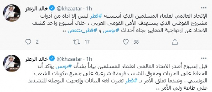 وأضاف: "الاتحاد العالمي لعلماء المسلمين الذي أسسته قطر ليس إلا أداة من أدوات مشروع الفوضى الذي يستهدف الأمن القومي العربي، خلال أسبوع واحد كشف الاتحاد عن ازدواجية المعايير تجاه أحداث تونس وقطر تنتفض".