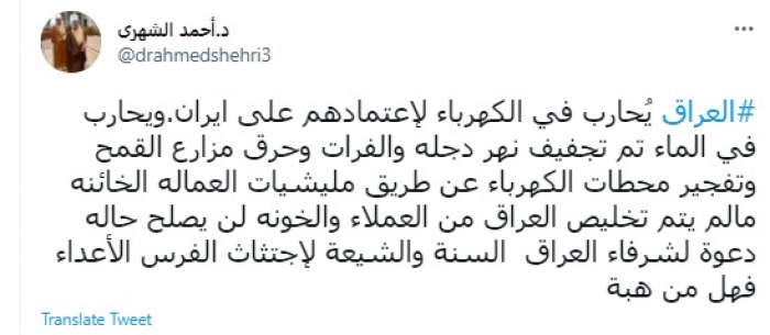 وقال في تغريدة عبر "تويتر" رصدها "المشهد العربي": "العراق يُحارب في الكهرباء لاعتمادهم على إيران. ويحارب في الماء تم تجفيف نهر دجله والفرات وحرق مزارع القمح وتفجير محطات الكهرباء عن طريق مليشيات العمالة الخائنة".