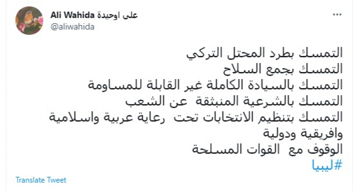 وقال في تغريدة عبر "تويتر" رصدها "المشهد العربي": "التمسك بطرد المحتل التركي وجمع السلاح وبالسيادة الكاملة غير القابلة للمساومة وبالشرعية المنبثقة عن الشعب".