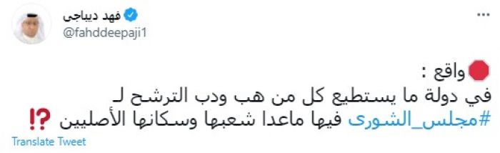 وقال في تغريدة عبر "تويتر" رصدها "المشهد العربي": "واقع: في دولة ما يستطيع كل من هب ودب الترشح لمجلس الشورى فيها ماعدا شعبها وسكانها الأصليين".