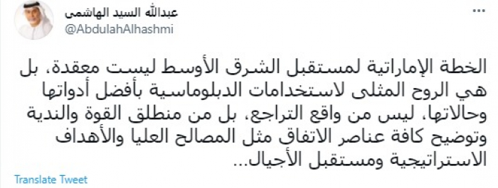 وقال في تغريدة عبر "تويتر" رصدها "المشهد العربي": "الخطة الإماراتية لمستقبل الشرق الأوسط ليست معقدة، بل هي الروح المثلى لاستخدامات الدبلوماسية بأفضل أدواتها وحالاتها، ليس من واقع التراجع، بل من منطلق القوة والندية وتوضيح كافة عناصر الاتفاق مثل المصالح العليا والأهداف الاستراتيجية ومستقبل الأجيال".