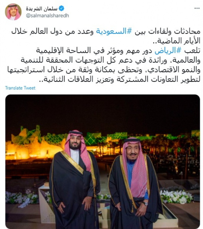 وكتب في تغريدة عبر "تويتر" رصدها "المشهد العربي": "محادثات ولقاءات بين السعودية وعدد من دول العالم خلال الأيام الماضية.. تلعب الرياض دور مهم ومؤثر في الساحة الإقليمية والعالمية، ورائدة في دعم كل التوجهات المحققة للتنمية والنمو الاقتصادي".