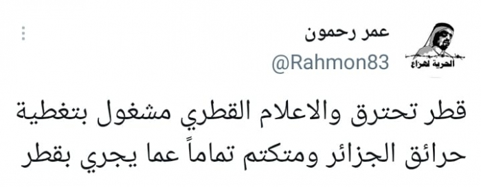 وأشار في تغريدة على حسابه بموقع التدوين المصغر تويتر، اليوم إلى أن: "قطر تحترق والإعلام القطري مشغول بتغطية حرائق الجزائر ومتكتم تماماً عما يجري بقطر".