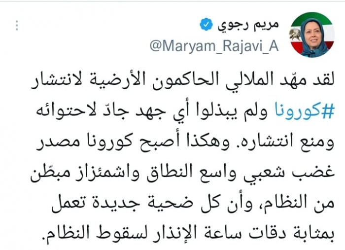 وقالت في تغريدة على حسابها بموقع التدوين المصغر تويتر اليوم إنه: "لقد مهّد الملالي الحاكمون الأرضية لانتشار كورونا ولم يبذلوا أي جهد جادّ لاحتوائه ومنع انتشاره".