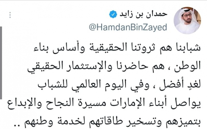 وتابع: "وفي اليوم العالمي للشباب يواصل أبناء الإمارات مسيرة النجاح والإبداع بتميزهم وتسخير طاقاتهم لخدمة وطنهم".