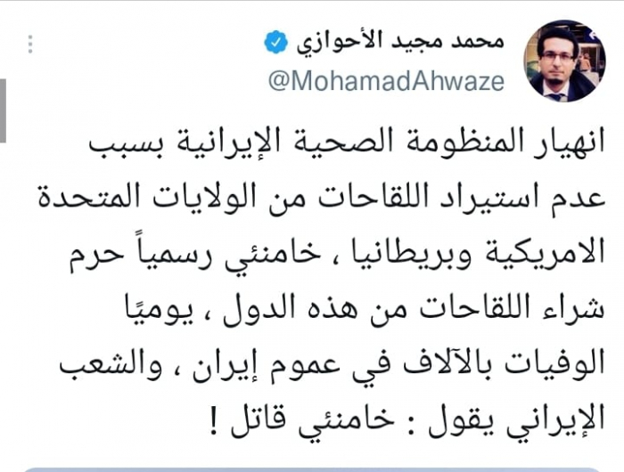 وأكد أن: "خامنئي رسمياً حرم شراء اللقاحات من هذه الدول، يوميًا الوفيات بالآلاف في عموم إيران، والشعب الإيراني يقول : خامنئي قاتل".