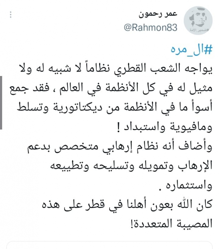 وأوضح في تغريدة على حسابه بموقع التدوين المصغر تويتر اليوم أن: "يواجه الشعب القطري نظاماً لا شبيه له ولا مثيل له في كل الأنظمة في العالم".