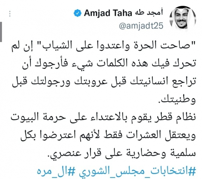 وأضاف أن: "نظام قطر يقوم بالاعتداء على حرمة البيوت ويعتقل العشرات فقط لأنهم اعترضوا بكل سلمية وحضارية على قرار عنصري"، مختتما بهاشتاج : "انتخابات مجلس الشوري وآل مره".