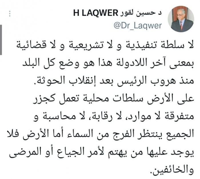 وأوضح في تغريدة على حسابه بموقع التدوين المصغر تويتر اليوم أنه: "لا سلطة تنفيذية و لا تشريعية و لا قضائية بمعنى آخر اللادولة، هذا هو وضع كل البلد منذ هروب الرئيس بعد إنقلاب الحوثة".