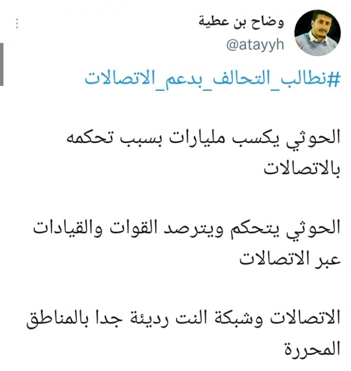 طالب وضاح بن عطية عضو الجمعية الوطنية، التحالف العربي بدعم قطاع الاتصالات، لمنع مليشيا الحوثي من الاستفادة من القطاع الحيوي في التجسس وتربح المليارات.