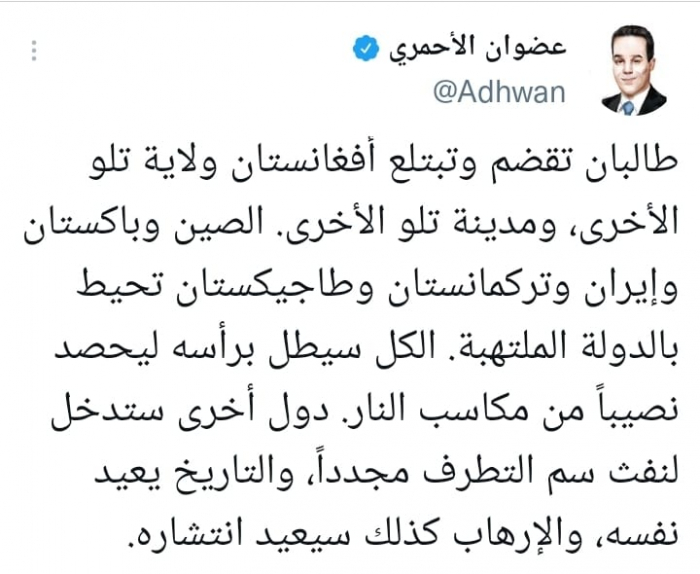 استنكر الإعلامي عضوان الأحمري تأهب دول مجاورة لأفغانستان لحظة مناسبة للاستفادة من الصراع مع طالبان، متوقعا عودة الإرهاب إلى شوارع كابول.