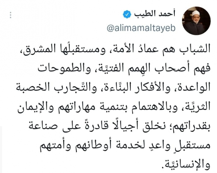 أشاد الدكتور أحمد الطيب شيخ الأزهر الشريف، بدور الشباب في نهضة الأمة وتلبية طموحاتها وصناعة مستقبلها، في اليوم العالمي للشباب