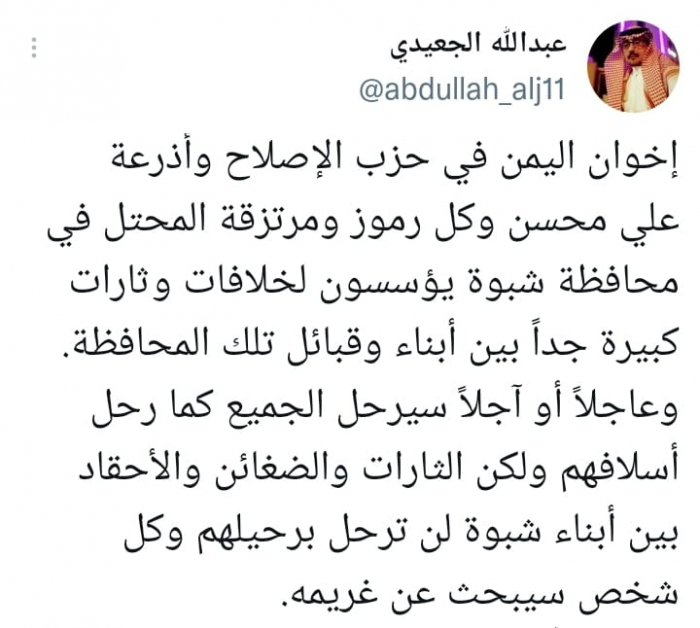 وأكد في تغريدة على حسابه بموقع التدوين المصغر تويتر اليوم أن: "إخوان اليمن في حزب الإصلاح وأذرعه علي محسن وكل رموز ومرتزقة المحتل في محافظة شبوة يؤسسون لخلافات وثارات كبيرة جداً بين أبناء وقبائل تلك المحافظة".