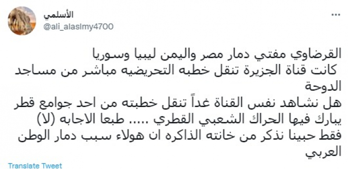 وقال في تغريدة عبر "تويتر" رصدها "المشهد العربي": "القرضاوي مفتي دمار مصر واليمن ليبيا وسوريا كانت قناة الجزيرة تنقل خطبه التحريضية مباشر من مساجد الدوحة".