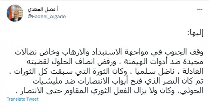 وكتب في تغريدة عبر "تويتر" رصدها "المشهد العربي": "وقف الجنوب في مواجهة الاستبداد والإرهاب وخاض نضالات مجيدة ضد أدوات الهيمنة، ورفض أنصاف الحلول لقضيته العادلة".