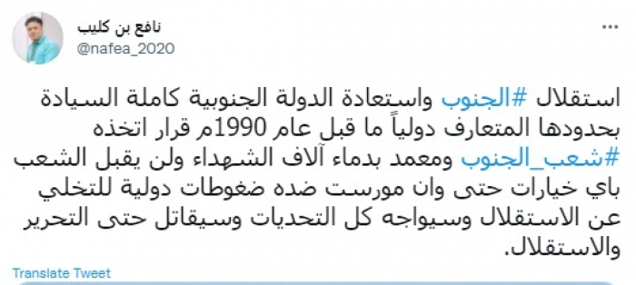 وكتب في تغريدة عبر "تويتر" رصدها "المشهد العربي": "استقلال الجنوب واستعادة الدولة الجنوبية كاملة السيادة بحدودها المتعارف دوليًا ما قبل عام 1990م قرار اتخذه شعب الجنوب ومعمد بدماء آلاف الشهداء".