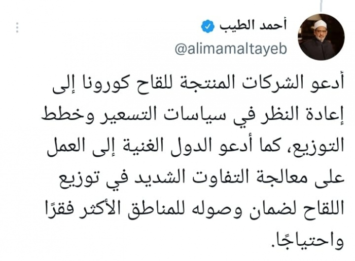 وصف الدكتور أحمد الطيب شيخ الأزهر الشريف، أن أزمة التفاوت في توزيع لقاحات كورونا تعد اختبارا إنسانيا حقيقيا يمكن تجاوزه بالتضامن.