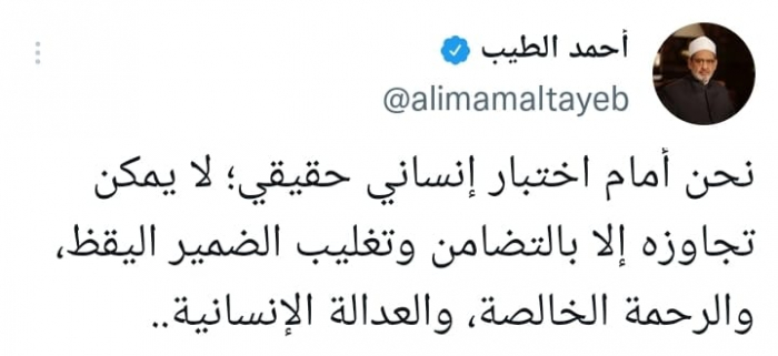وشدد في تغريدة على حسابه بموقع التدوين المصغر تويتر، اليوم على أننا: "أمام اختبار إنساني حقيقي؛ لا يمكن تجاوزه إلا بالتضامن وتغليب الضمير اليقظ، والرحمة الخالصة، والعدالة الإنسانية".