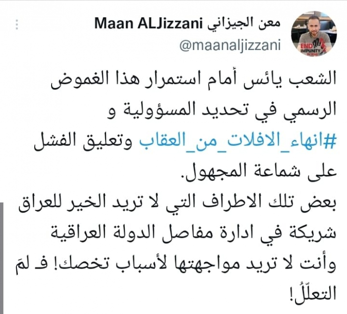 وأكد في تغريدة على حسابه بموقع التدوين المصغر تويتر، اليوم أن: "الشعب يائس أمام استمرار هذا الغموض الرسمي في تحديد المسؤولية وإنهاء الإفلات من العقاب وتعليق الفشل على شماعة المجهول".