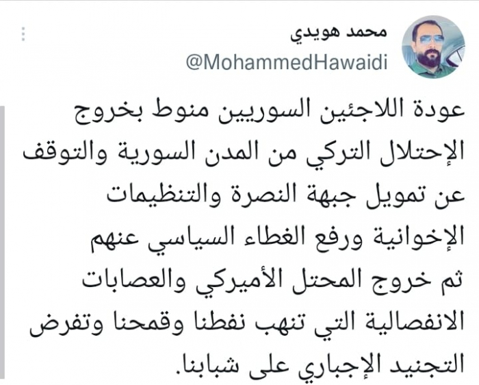 وشدد في تغريدة على حسابه بموقع التدوين المصغر تويتر، اليوم على أن: "عودة اللاجئين السوريين منوط بخروج الإحتلال التركي من المدن السورية".