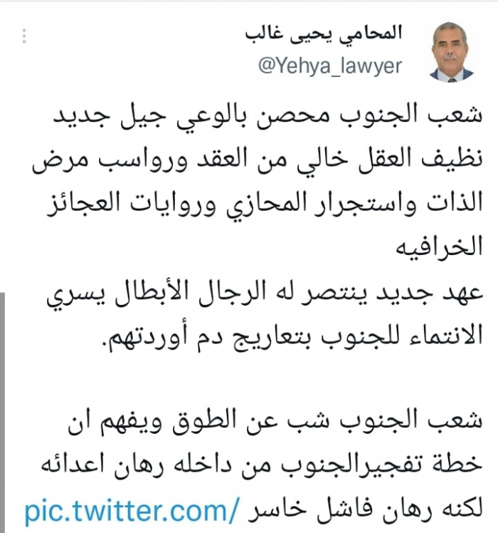 وأشار في تغريدة على حسابه بموقع التدوين المصغر تويتر، اليوم على أن: "شعب الجنوب محصن بالوعي"، موضحا أن هناك: "جيل جديد نظيف العقل خالي من العقد ورواسب مرض الذات واستجرار المحازي وروايات العجائز الخرافية".