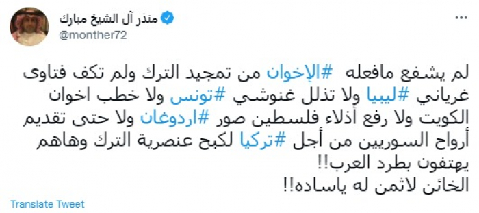 وكتب في تغريدة عبر "تويتر" رصدها "المشهد العربي": "لم يشفع ما فعله الإخوان من تمجيد الترك ولم تكف فتاوى غرياني ليبيا ولا تذلل غنوشي تونس ولا خطب إخوان الكويت ولا رفع أذلاء فلسطين صور أردوغان ولا حتى تقديم أرواح السوريين من أجل تركيا لكبح عنصرية الترك وها هم يهتفون بطرد العرب".