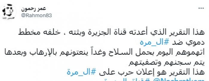 وقال في تغريدة عبر "تويتر" رصدها "المشهد العربي": "هذا التقرير الذي أعدته قناة الجزيرة وبثته، خلفه مخطط دموي ضد آل مرة اتهموهم اليوم بحمل السلاح وغدا ينعتونهم بالإرهاب وبعدها يتم سجنهم وتصفيتهم".