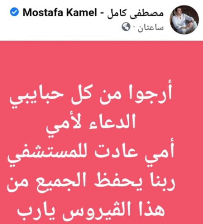 وكتب "كامل" عبر حسابه الرسمي بموقع فيس بوك:" أرجو من كل حبايبي الدعاء لأمي، أمي عادت للمستشفى ربنا يحفظ الجميع من هذا الفيروس يا رب".