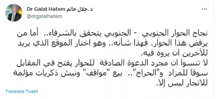 وكتب في تغريدة عبر "تويتر" رصدها "المشهد العربي": "نجاح الحوار الجنوبي - الجنوبي يتحقق بالشرفاء.. أما من يرفض هذا الحوار، فهذا شأنه.. وهو اختار الموقع الذي يريد للآخرين أن يروه فيه".