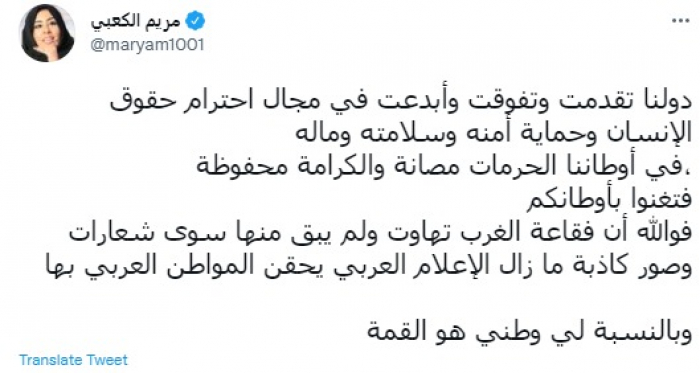 وقالت في تغريدة عبر "تويتر" رصدها "المشهد العربي": "دولنا تقدمت وتفوقت وأبدعت في مجال احترام حقوق الإنسان وحماية أمنه وسلامته وماله، في أوطاننا الحرمات مصانة والكرامة محفوظة فتغنوا بأوطانكم".