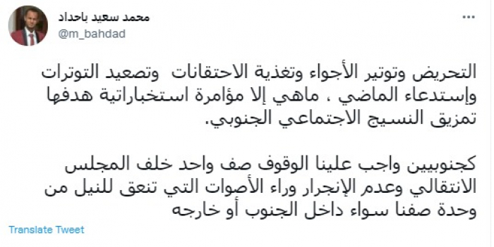 وقال في تغريدة عبر "تويتر" رصدها "المشهد العربي": "التحريض وتوتير الأجواء وتغذية الاحتقانات وتصعيد التوترات واستدعاء الماضي، ماهي إلا مؤامرة استخباراتية هدفها تمزيق النسيج الاجتماعي الجنوبي".