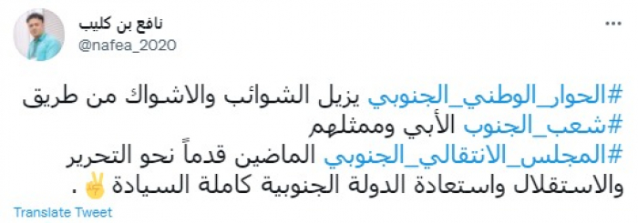 وقال في تغريدة عبر "تويتر" رصدها "المشهد العربي": "الحوار الوطني الجنوبي يزيل الشوائب والأشواك من طريق شعب الجنوب الأبي وممثلهم المجلس الانتقالي الجنوبي الماضين قدمًا نحو التحرير والاستقلال واستعادة الدولة الجنوبية كاملة السيادة".